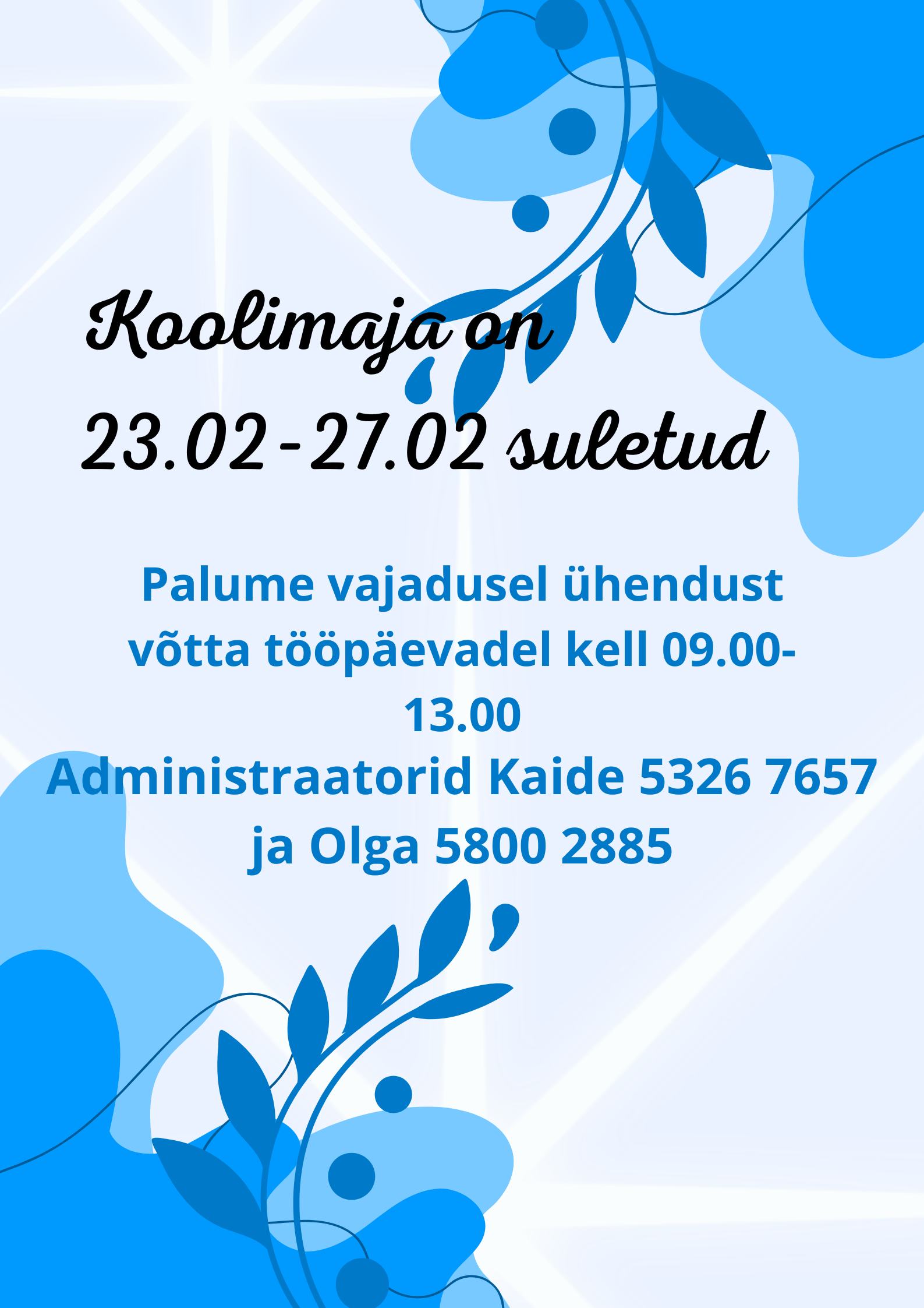 Anname teada, et koolimaja on 23.–27. veebruaril suletud.