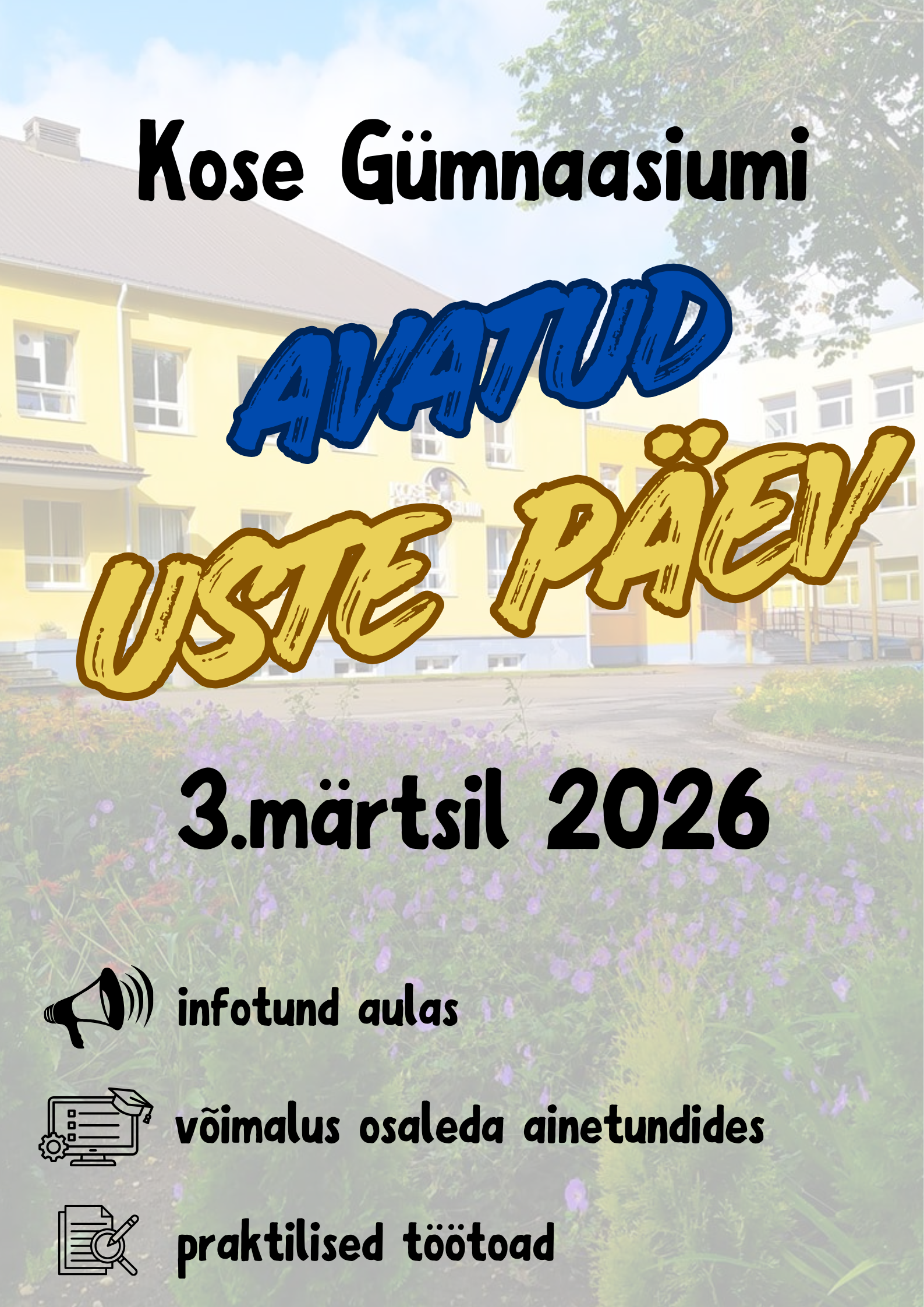 Kose Gümnaasium kutsub huvilisi avatud uste päevale, mis toimub 3. märtsil 2026. Tegemist on hea võimalusega tutvuda kooli õppekorralduse ja igapäevase koolieluga.