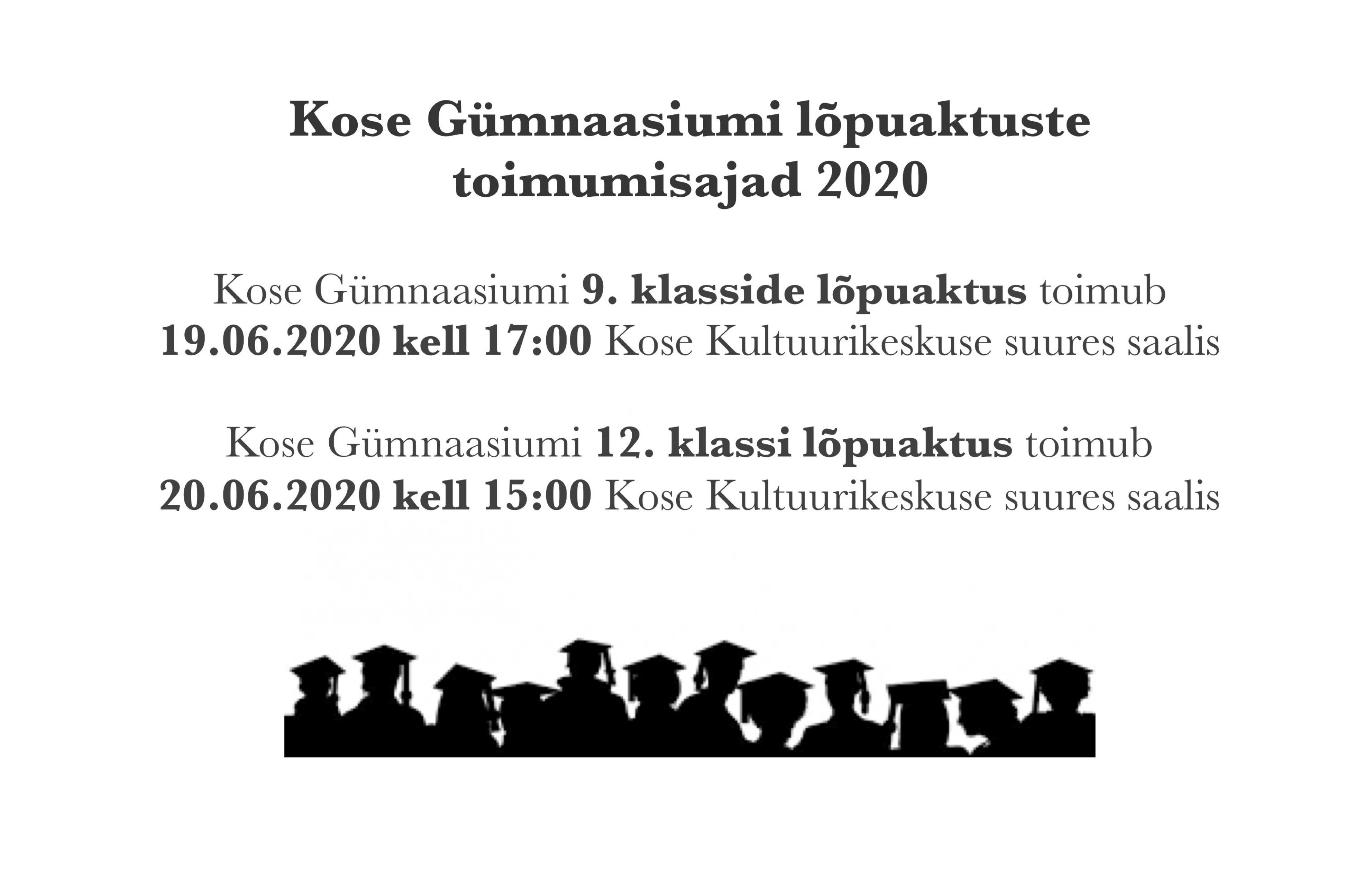 Kose Gümnaasiumi 9. klasside lõpuaktus toimub 19.06.2020 kell 17:00 Kose Kultuurikeskuse suures saalis; Kose Gümnaasiumi 12. klassi lõpuaktus toimub 20.06.2020 kell 15:00 Kose Kultuurikeskuse suures saalis.