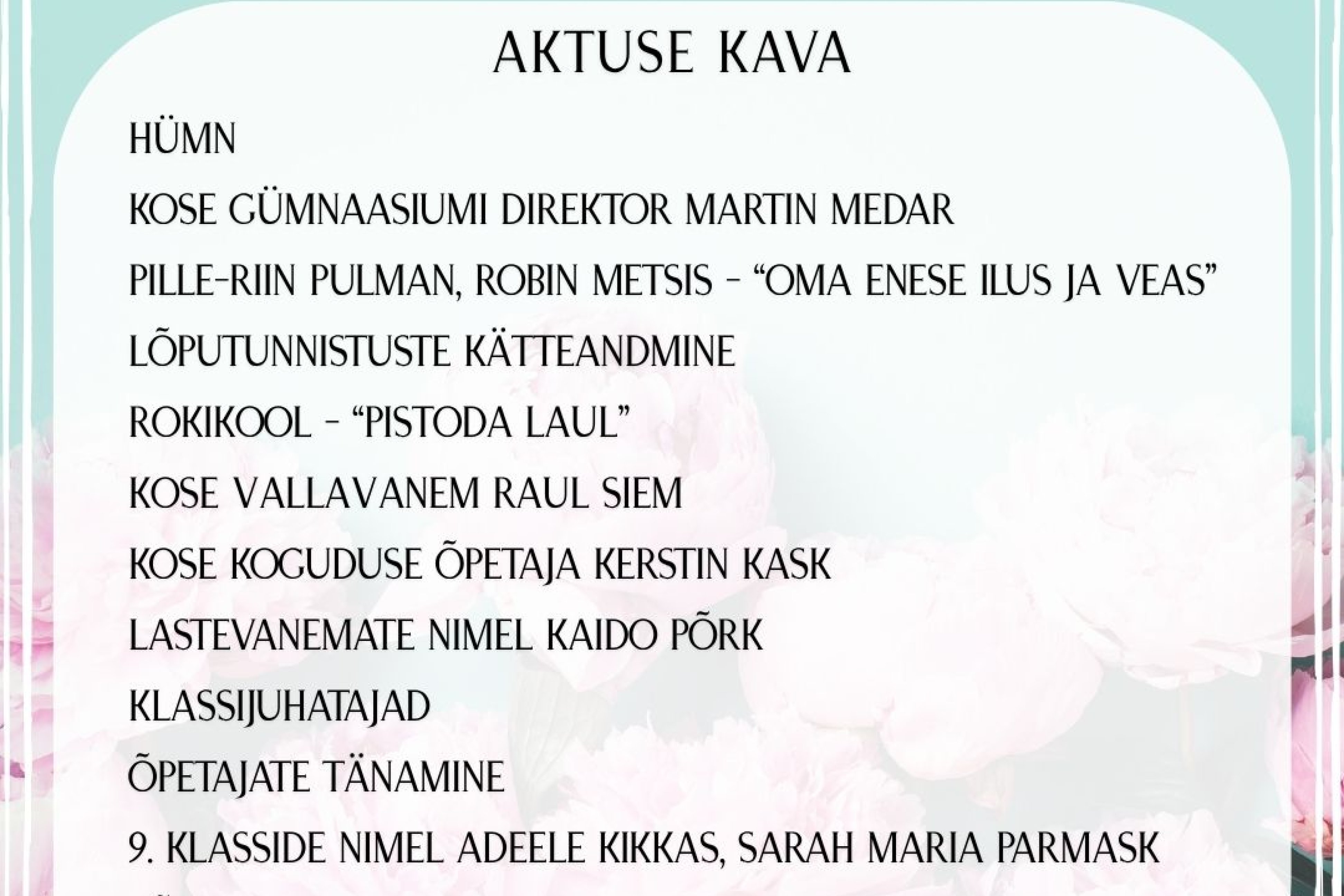 Kose Gümnaasiumi põhikooli lõpuaktus toimub reedel, 20. juunil 2025 kell 12.00 Kose Kultuurikeskuse suures saalis.